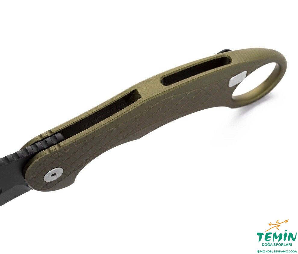 Çakılar değişik renkler kazandırılmış ergal (7075) alüminyum saplara sahip olarak sunulmuştur. Kilit görevi gören kanadın uç kısmına, aşınmayı önlemek için, çelik bir parça vidalanmıştır. Hem konforlu hem de iyi kavranan sap, namlu hareketlerini iyi kontrol etmeye yardımcıdır. Sap yüzeyleri üzerinde kavramaya yardımcı girinti ve çıkıntılar oluşturmak için damalı bir desende karar kılınmıştır. Artık hemen hemen her Karambit tarzı bıçakta karşılaşılan sap sonundaki parmak geçebilecek delik (retention ring) de yerini almıştır.