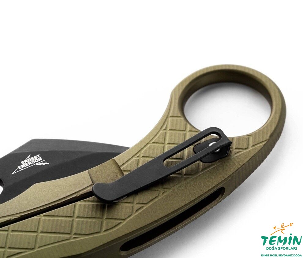 Uç yukarı olmak üzere yönü değiştirilebilen namluyla uyumlu kılınan paslanmaz çelik cep klipsleri, çakının kolay taşınmasına ve ‘‘Emerson Dalga Özelliği’’nin kullanılmasına yardımcıdır.