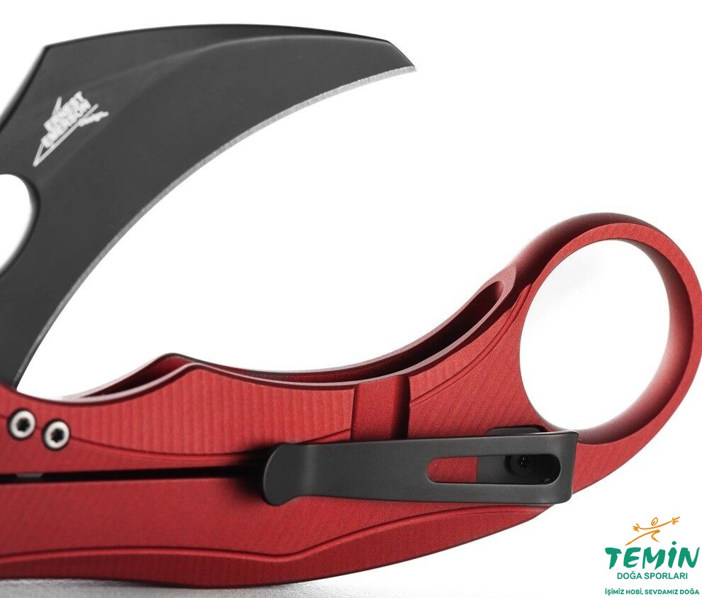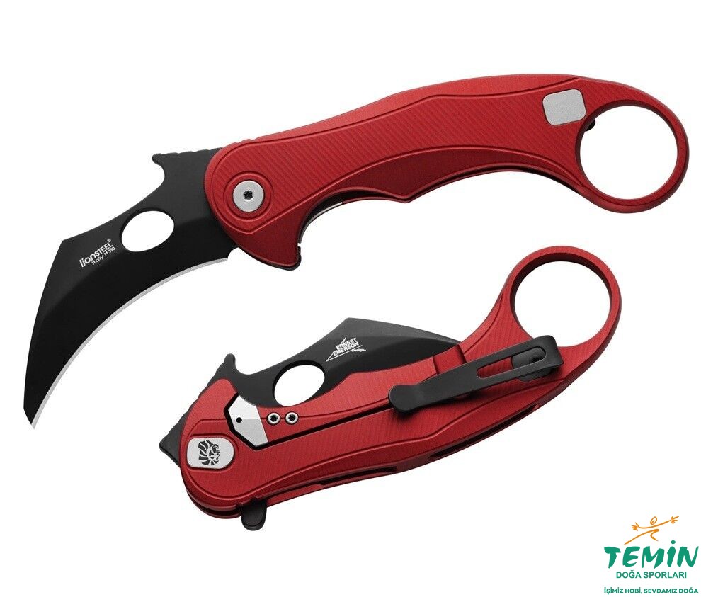 Lionsteel L.E.One Mid-Red/Black; SOLID çerçeve kilitli alüminyum sapı ve Böhler M390 çeliğiyle 84 gr hafif, 58 mm namlulu kompakt karambit EDC çakıdır.