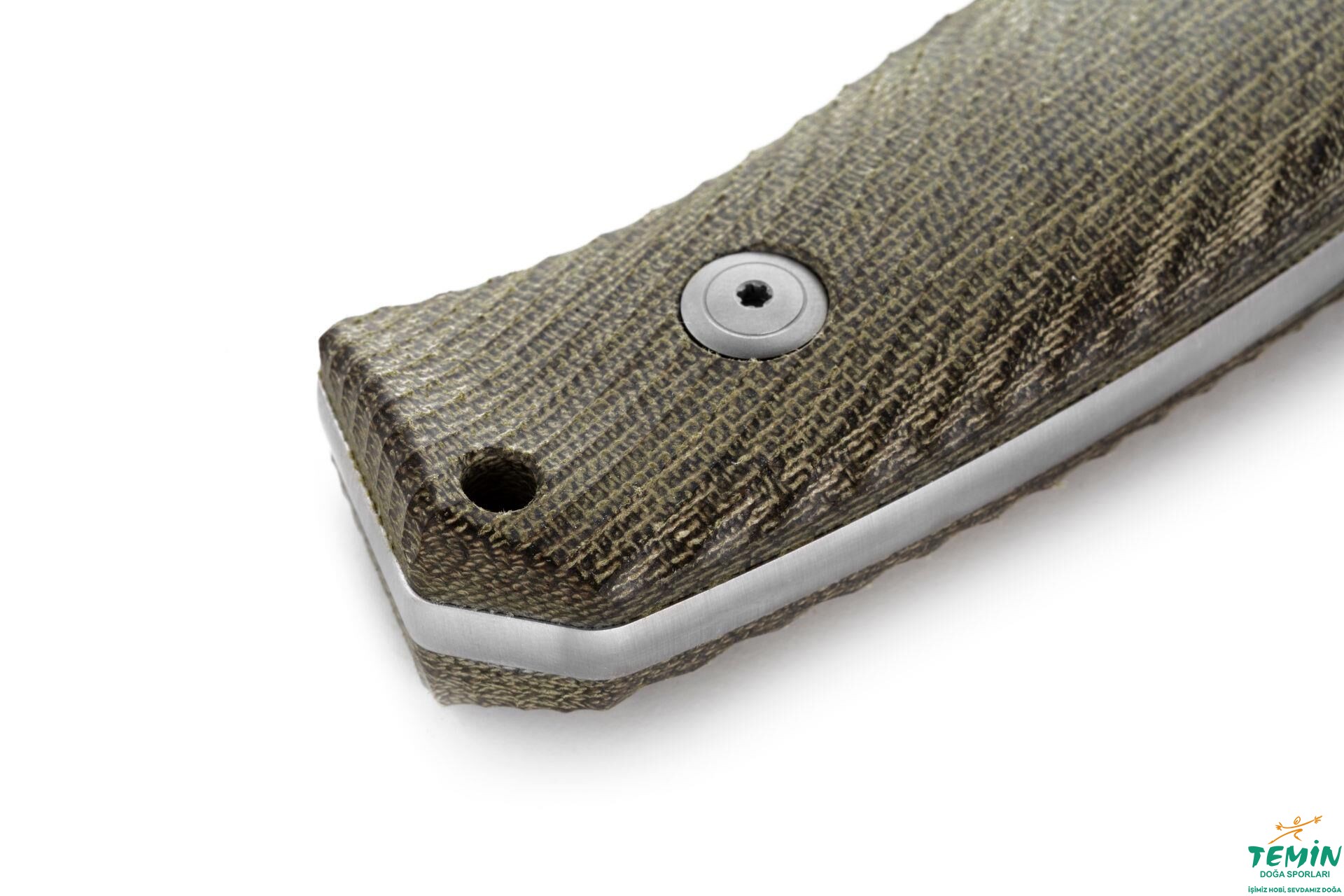 Üzerinde çalışılarak daha iyi kavranması için 3 boyutlu doku kazandırılan hâki renkli kanaviçe mikarta (green canvas micarta) sap malzemesi, Torx T8 vidalarla kuyruğa sabitlenmiştir. Genişçe dokulu ve yüksek yoğunluklu bu malzeme, asıl olarak sağlamlık ve rutubet başta olmak üzere çevresel koşullara karşı dayanıklılık sunmaktadır.