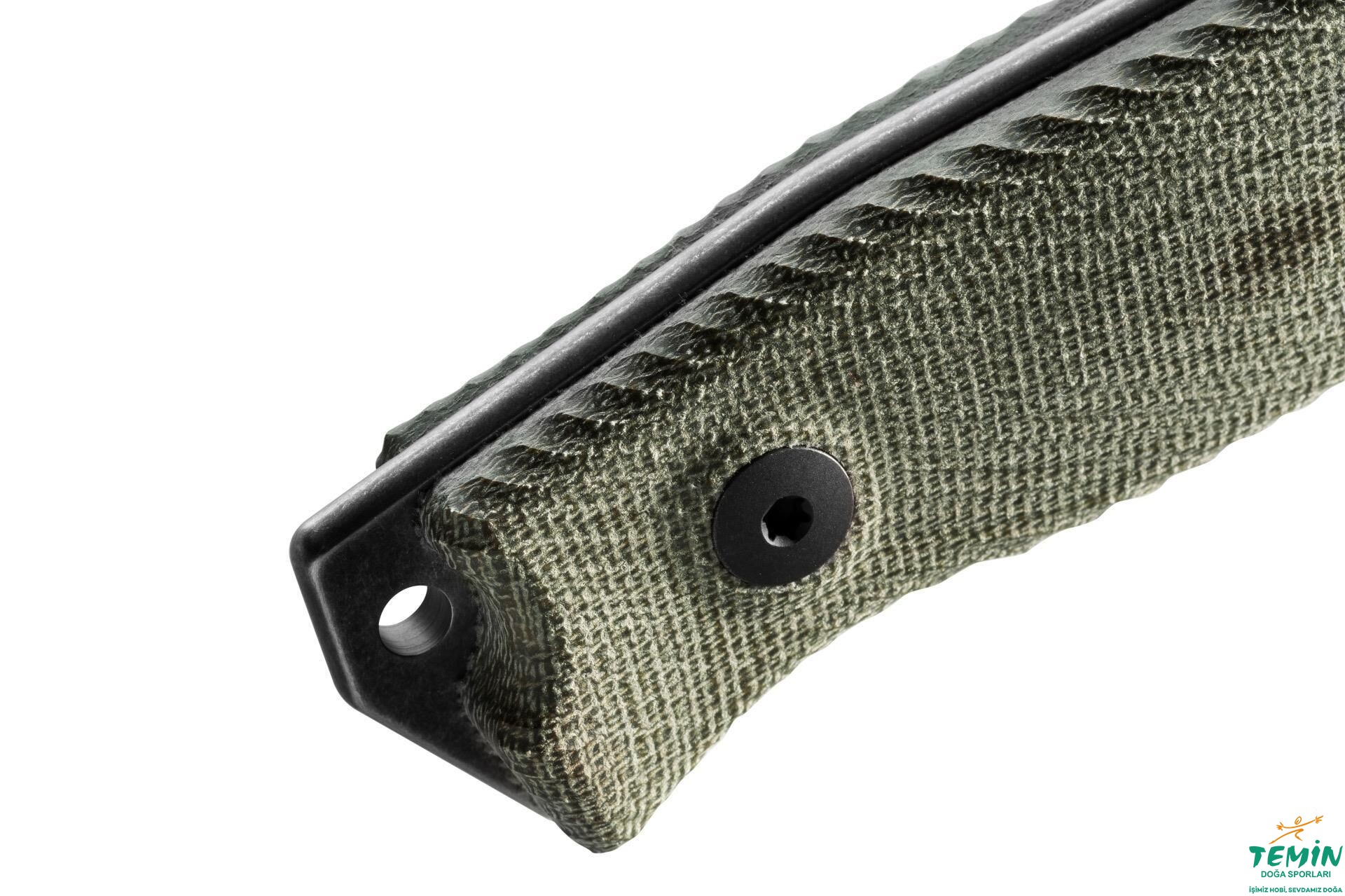 Daha iyi kavranabilmesi için üzerinde 3 boyutlu çalışılan ve pürüzlü bir doku kazandırılan hâki renkli kanaviçe mikarta (green canvas micarta) sap malzemesi, Torx T8 vidalarla kuyruğa sabitlenmiştir. Genişçe dokulu ve yüksek yoğunluklu bu malzeme, asıl olarak sağlamlık ve rutubet başta olmak üzere çevresel koşullara karşı dayanıklılık sunmaktadır. Bıçak, uzatılmış kuyruk (extended tang) yapısındadır. Saptan dışarı taşan ve üzerinde kordon deliği (lanyard hole) de bulunan kısmı vurup parçalama amaçlı kullanabilirsiniz.