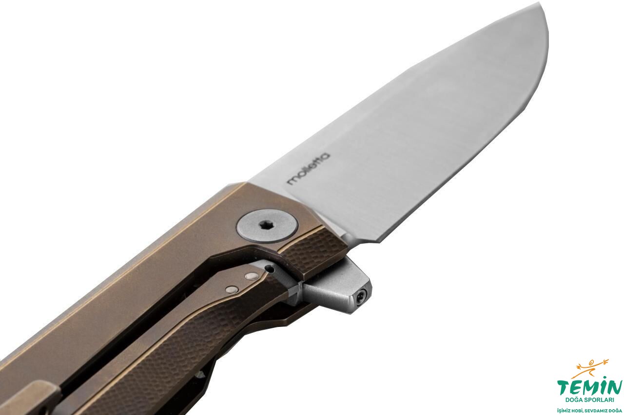 İzlediğiniz versiyon olan MT01 BR’de, sapın her iki kanadı, ara parça ve tabii ki cep klipsi titanyumdur ve çakının üzerindeki tüm titanyum parçalara bronz renk kazandırılmıştır.