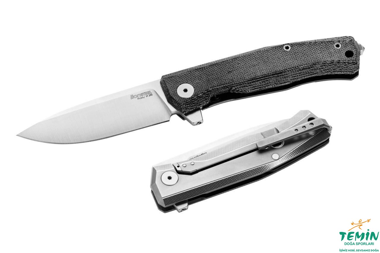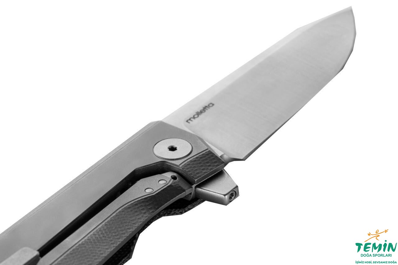 İzlediğiniz versiyon olan MT01 CVB’de; sapın kilit görevindeki kanadı titanyumdan, ön taraftaki kanat ise siyah renkte kanaviçe (canvas) mikartadan üretilmiştir. Ara parça, siyah renkli, G10’dur. Böylelikle, hafif ama sağlam ve hem şık hem de kolay kavranabilen bir yapı elde edilmiştir. Çakının üzerindeki tüm titanyum parçalar gri renktedir.