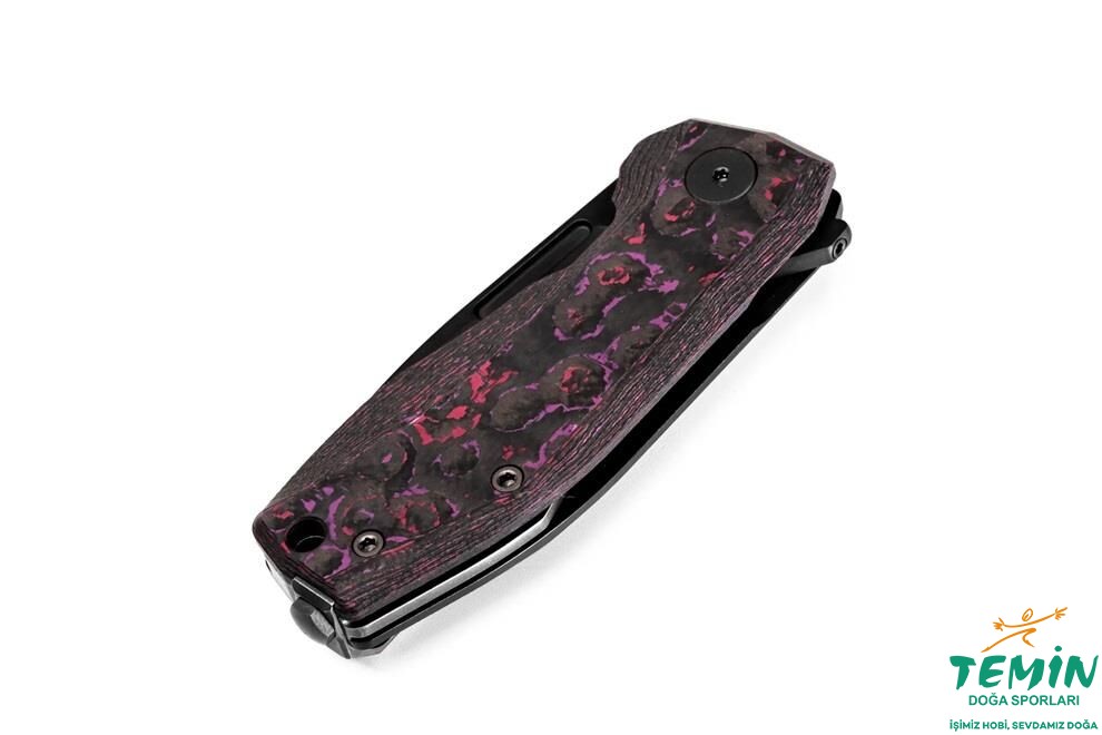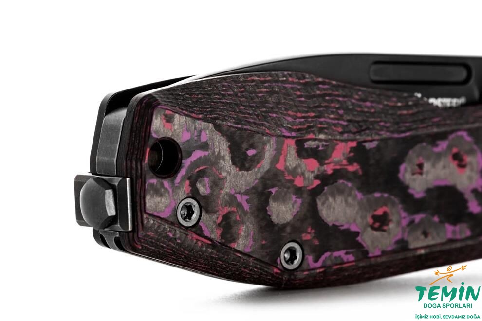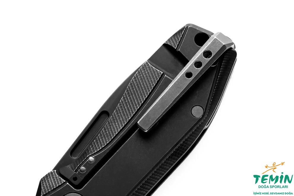 Titanyum çerçeve kilitleme çubuğu, titanyum parçanın zaman içinde bıçağın dönmesiyle aşınmasını önlemeye yarayan sertleştirilmiş bir çelik uçla güçlendirilmiştir.