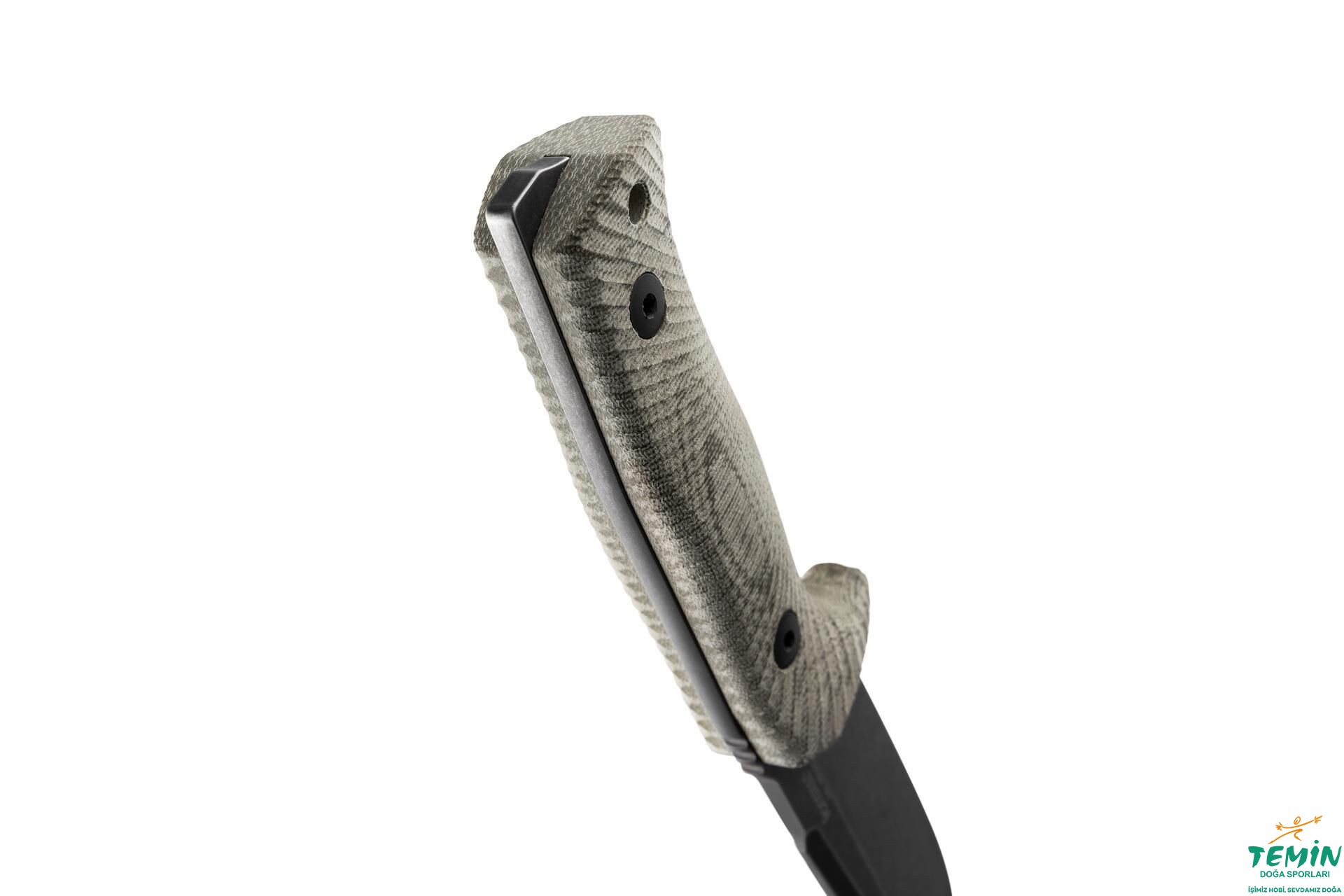 Genişçe dokulu ve yekpare kanaviçe mikarta (canvas micarta) sap, bıçağı üç yönden (yanlar ve ön) tamamen sararken alt kısmın yarıya kadarını da kapatıyor. Böylelikle sap kısmında sadece sırt ve uzatılmış kuyruk (extended tang) olarak dışa taşan [o da olmasa kapsüllenmiş (encapsulated) bıçak tanımı rahatlıkla yapılabilir], vurma amaçlı kullanılan bir kısım kuşatılmamış kalıyor. Asıl olarak sağlamlık ve rutubet başta olmak üzere çevresel koşullara karşı dayanıklılık sunan mikarta sap, hâki renkte.
