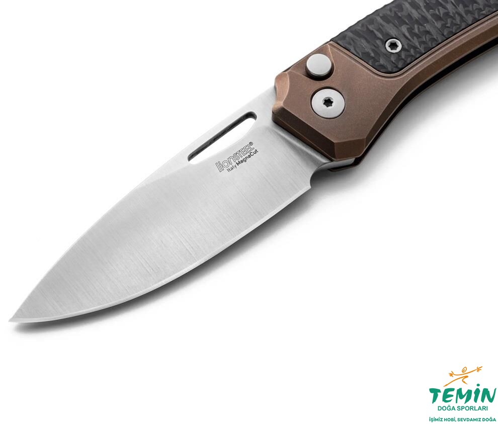 CPM MagnaCut çelik çakı saten kaplamalıdır, gövde titanyumdan yapılmıştır, kabza ise karbon fiber, Canvas veya G10 bloktan frezelenmiştir.