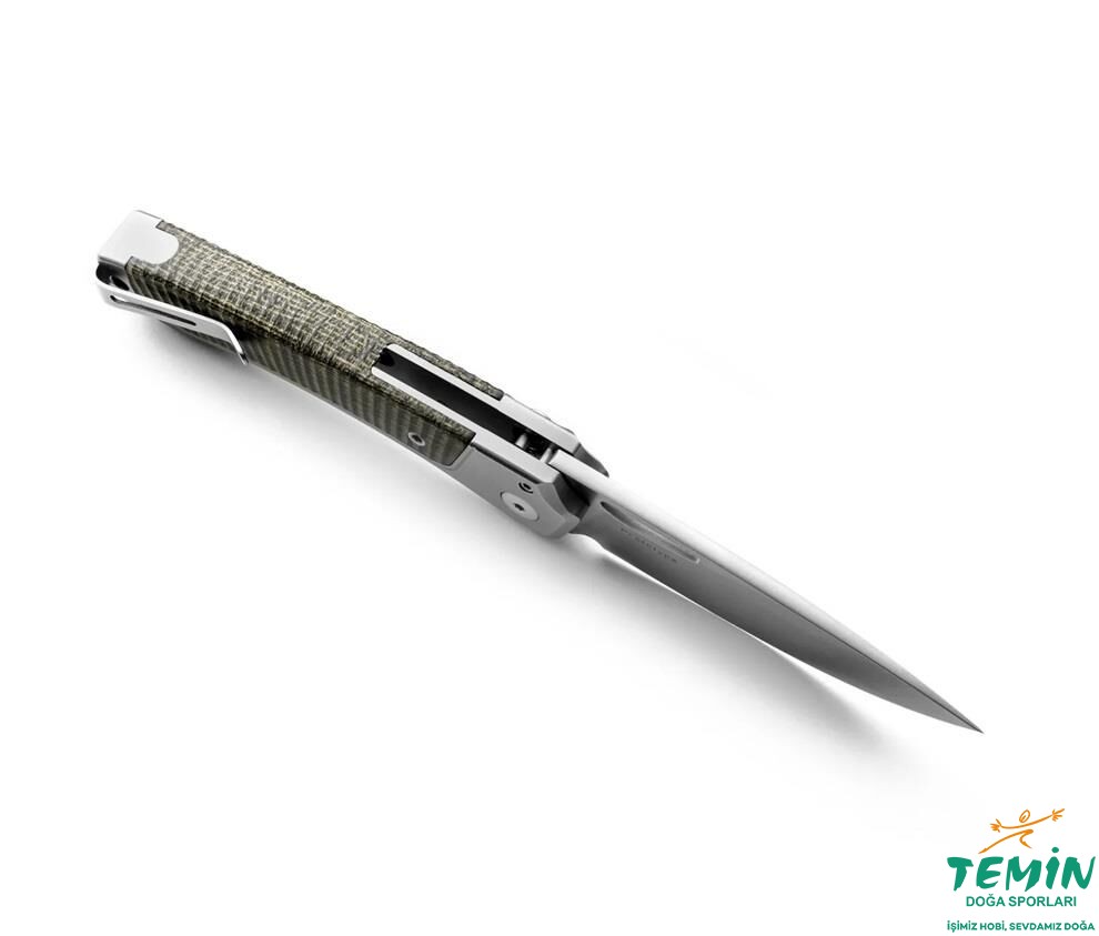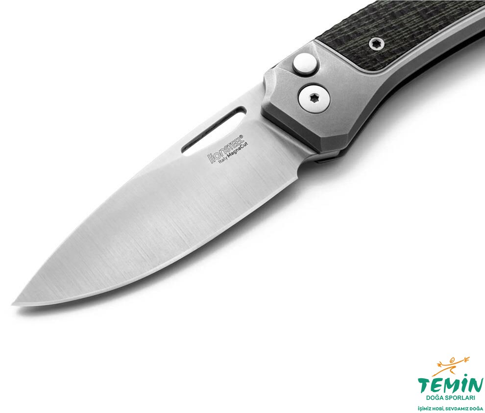 CPM MagnaCut çelik çakı saten kaplamalıdır, gövde titanyumdan yapılmıştır, kabza ise karbon fiber, Canvas veya G10 bloktan frezelenmiştir.