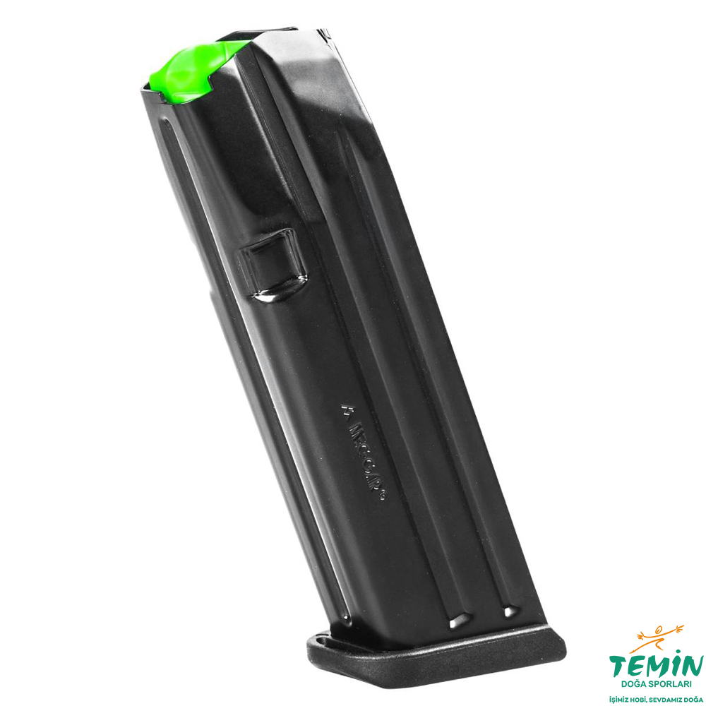 Dayanıklılık için ısıl işlem görmüş karbon çelik gövdeye sahip, kolay yükleme sağlayan, korozyon ve sürtünme önleyici kaplamalı, yüksek görünürlüklü yeşil gerder ve yüksek darbe dayanımlı polimer şarjör tabanına sahip 9 mm Glock 17 tabanca için İtalyan üretimi 18 mermi kapasiteli yedek şarjör.