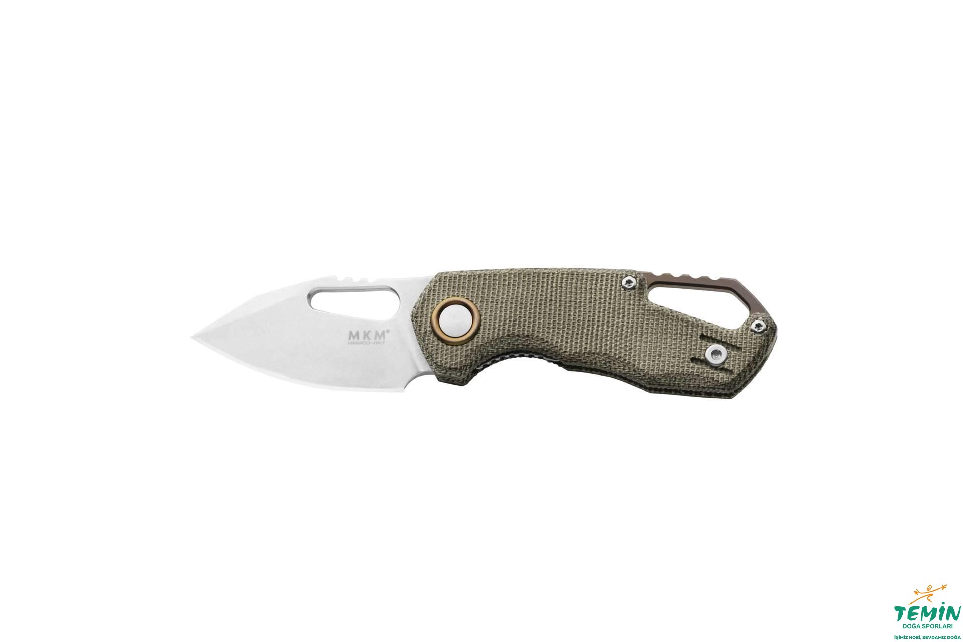 Yandan kilitli (linerlock) çakıda, hâki renkte kanaviçe mikarta (green canvas micarta) sap malzemesi bulunmaktadır. Kanaviçe mikarta, keten (linen) mikartaya göre daha geniş gözenekli olup daha kaba ve kavranabilir yapıdadır. Mikarta sap hem suya hem de ateşe dayanıklıdır ve ıslak koşullarda bile iyi kavranabilmektedir. Sap malzemesi içine gömülü çelik astarlar, sağlamlığı pekiştirmektedir. Sapın yerine takılmasında yine paslanmaz çelik bağlantı elemanlarının [Cıvataları söküp takabileceğiniz tork anahtarı (6/8) da pakete dâhildir.] kullanıldığı bu versiyonda, anodize edilen ve hâki renkle uyum içindeki bronz rengi alan titanyum ara parça sayesinde, geniş bir kordon deliği (lanyard hole) elde edilmiştir. İçinden kapaklı çengel (çengel karabina da denmektedir) geçebilecek genişlikte olmasıyla pratiklik (Dağcılıkta, rafting sırasında ve hatta doğa yürüyüşlerinde bu tür taşıma tercih edilebilmektedir.) sağlayan bu kordon deliği, namludaki başparmak deliği ile uyum taşımaktadır. Her iki deliğin arkasında da kavramaya yardımcı çentiklere yer verilerek çakıya hâkimiyet artırılmıştır. MKM’nin alametifarikası sayılan pivot bağlantı elemanı pulu, yine bronz renkte anodize edilerek, ara parçayla uyumlu kılınan titanyumdur.
