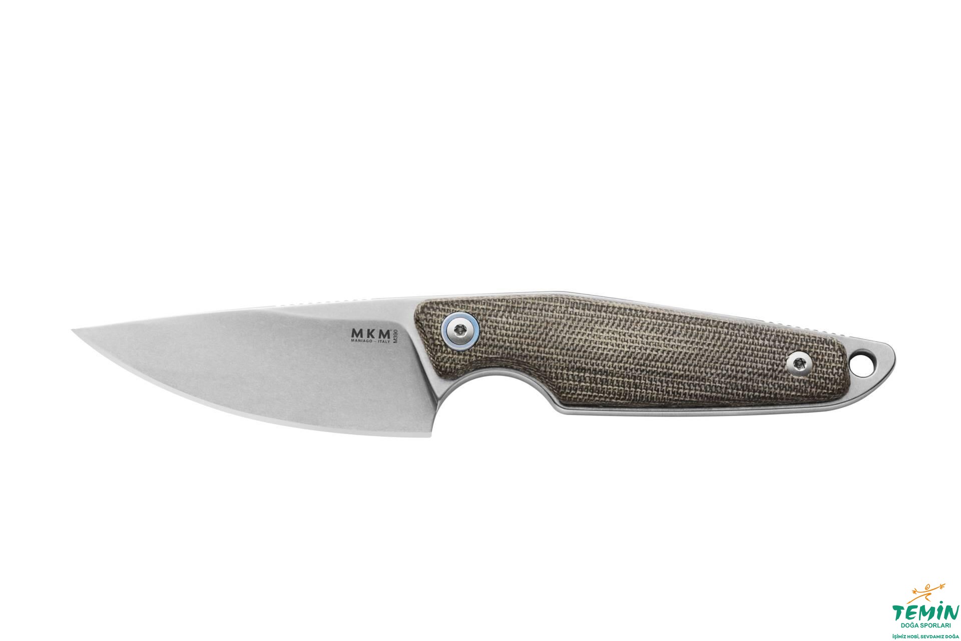 İzlediğiniz ürün (MK MA01-GC: MKM Makro 1 Green Canvas), yuvarlak uç (drop point) yapısındadır ve hâki renkte kanaviçe mikarta (green canvas micarta) sap malzemesine sahiptir. Kanaviçe mikarta, keten (linen) mikartaya göre daha geniş gözenekli olup daha kaba ve kavranabilir yapıdadır. Mikarta sap hem suya hem de ateşe dayanıklıdır ve ıslak koşullarda bile iyi kavranabilmektedir. Uzatılmış kuyruk (extended tang) yapısındaki bıçakta, kuyruk konturlarını içeriden takip eden bu dayanıklı ve şık sap malzemesinin yerine takılmasında cıvatalardan faydalanılmıştır. Bağlantı elemanının pulu (Bu pul, koleksiyonun alametifarikası hâlindedir.), anodize edilerek mavi renk almış, titanyumdur. Ergonomik sapın kavisleri ve geniş parmak oluğu (parmağınızı namludan belirgin biçimde ayırmaktadır), sağlam ve konforlu kavramaya imkân tanımaktadır. Dış konturlara uygun olarak içi boşaltılan sap, hafifliğe katkı sağlamaktadır.