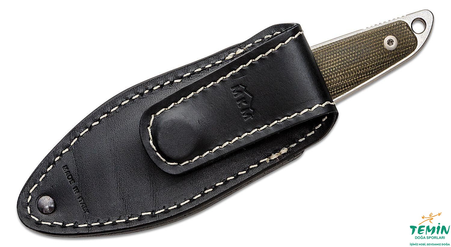 Uzatılmış kuyruğu üzerinde kordon deliğine (lanyard hole) de yer verilen bıçağın, deri kılıfı (siyah) bulunmaktadır. Kılıfın tasarımına özen gösterildiğini belirtmek gerekir. Bıçak, her iki yönü ile de kılıfa girebilmekte ve bu sayede sağ ya da sol elini kullananlar için problem oluşturmamaktadır. Giysilere entegre olabilmesi için arkadan sabitlenebilen manyetik kilide sahip kılıf sayesinde bıçağı, cepte (Kılıfın manyetik kilidi, kumaşı sıkıştırarak onun üzerinden arka tarafa sabitlendiğinde, cepte tutunma sağlamaktadır.) ya da kemerinize takarak taşıyabilirsiniz.