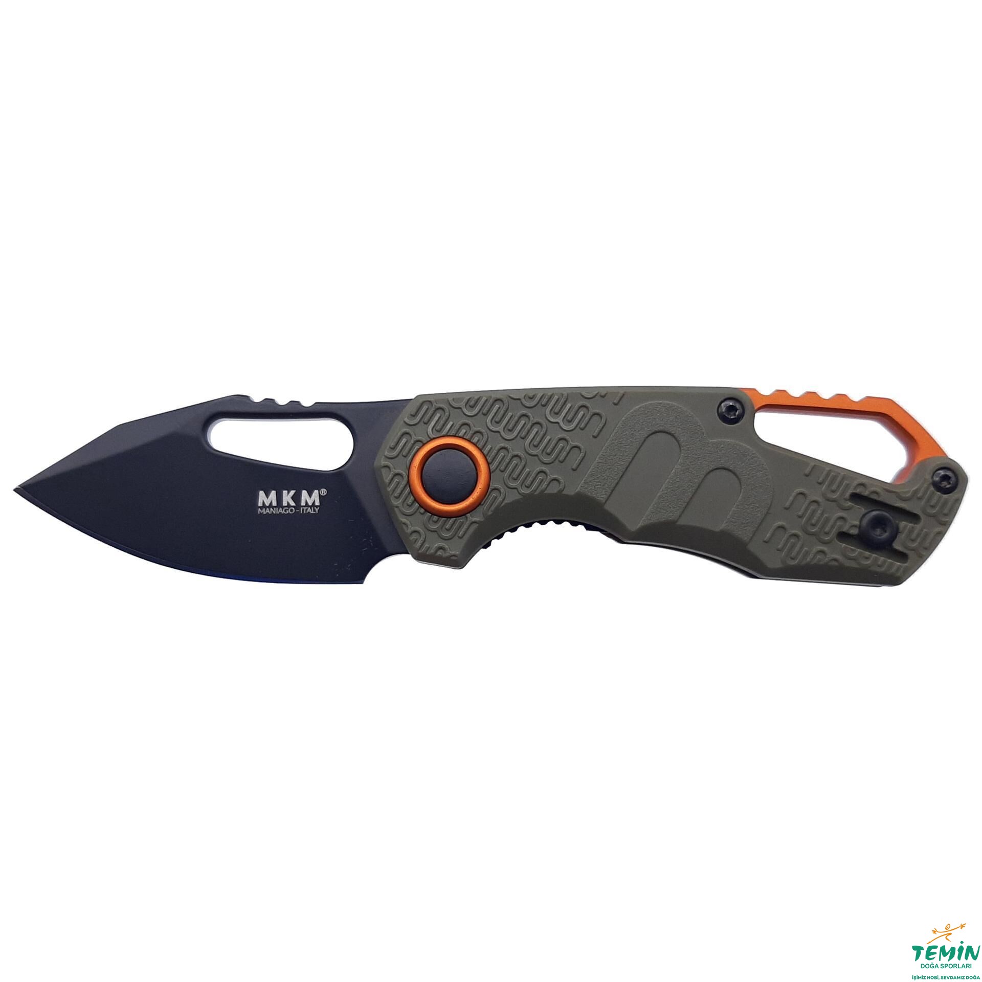 Anodize edilerek doğada kolay görünen turuncu rengi alan alüminyum ara parça sayesinde geniş bir kordon deliği (lanyard hole) elde edilmiştir. İçinden kapaklı çengel (çengel karabina da denmektedir) geçebilecek genişlikte olmasıyla pratiklik (Dağcılıkta, rafting sırasında ve hatta doğa yürüyüşlerinde bu tür taşıma tercih edilebilmektedir.) sağlayan bu kordon deliği, namludaki başparmak deliği ile de uyum taşımaktadır. Her iki deliğin arkasında da kavramaya yardımcı çentiklere yer verilerek çakıya hâkimiyet artırılmıştır. MKM’nin alametifarikası sayılan mavi renkte anodize edilen pivot bağlantı elemanı pulunun yerini turuncu renkte anodize edilen alüminyum pul almıştır.