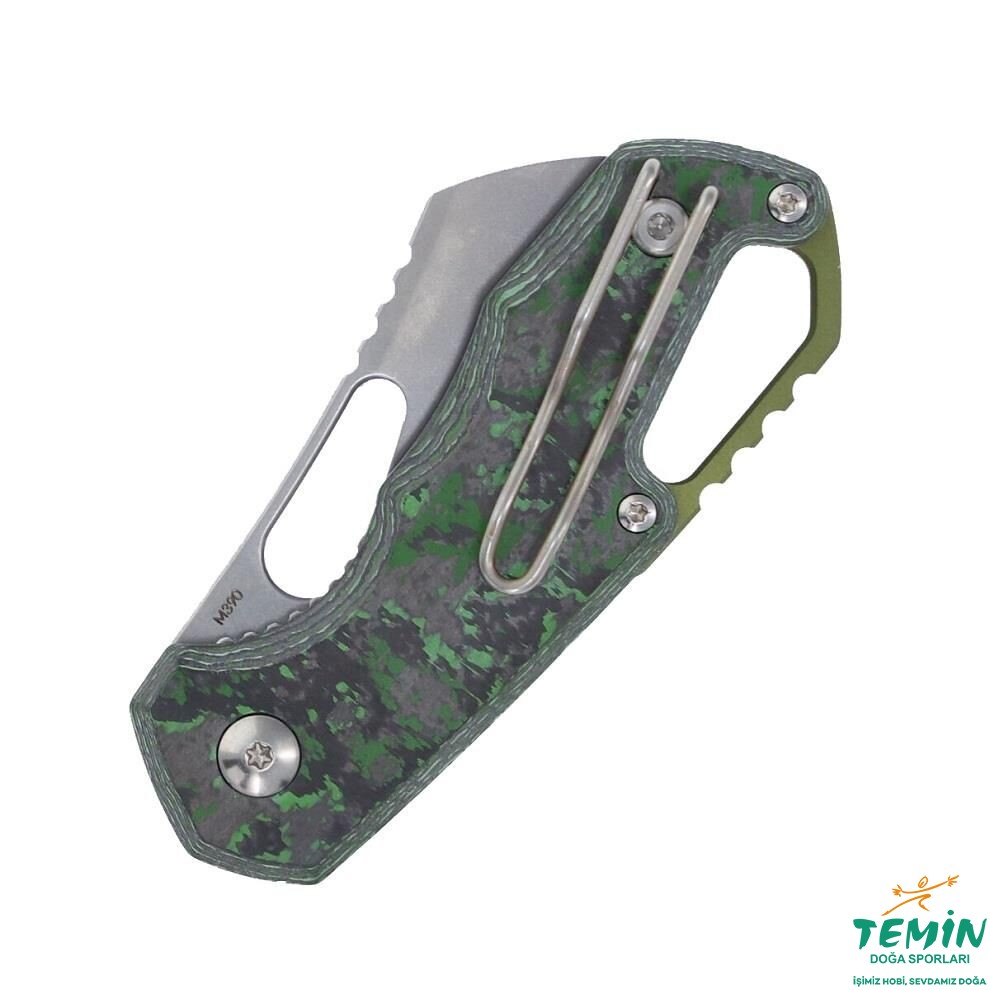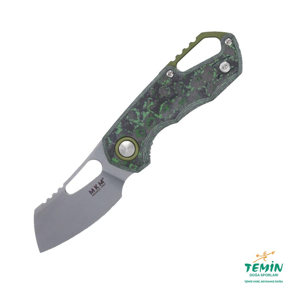 Yandan kilitli (linerlock) çakının sap kanatları, özel bir karbon fiberden (Yenilenebilir enerji kaynakları kullanan ‘‘Fat Carbon Materials’’ tarafından imal edilen ‘‘Jungle Wear’’ ismindeki hafif, dayanıklı ve şık kompozit malzemeye, adı üzerinde, yağmur ormanlarının korunmasının önemi ilham vermiştir. Dünyadaki oksijenin yaklaşık %20'sini üreten yağmur ormanları, kirlilik seviyesinin azaltılmasında da çok önemli rol oynamaktadır. Ormanda kamuflaj sağlayacak biçimde yeşilin iki tonuyla oluşturulan malzemede, elle yerleştirilen karbon fiber katmanların epoksi ile birleştirilmesiyle, hayranlık uyandıran bir görünüm elde edilmiştir.) imal edilmiştir. Sap malzemesi içine gömülü çelik astarlar, sağlamlığı pekiştirmektedir. Sapın yerine takılmasında paslanmaz çelik bağlantı elemanlarının [Cıvataları söküp takabileceğiniz tork anahtarı (6/8) da pakete dâhildir.] kullanıldığı bu versiyonda, anodize edilerek hâki renk alan alüminyum ara parça sayesinde, geniş bir kordon deliği (lanyard hole) elde edilmiştir. İçinden kapaklı çengel (çengel karabina da denmektedir) geçebilecek genişlikte olmasıyla pratiklik (Dağcılıkta, rafting sırasında ve hatta doğa yürüyüşlerinde bu tür taşıma tercih edilebilmektedir.) sağlayan bu kordon deliği, namludaki başparmak deliği ile uyum taşımaktadır. Kordon deliğinin arkasında da kavramaya yardımcı çentiklere yer verilerek çakının daha iyi kavranması sağlanmıştır. MKM’nin alametifarikası sayılan pivot bağlantı elemanı pulu, yine hâki renk alacak biçimde anodize edilerek, ara parçayla uyumlu kılınan alüminyumdur.