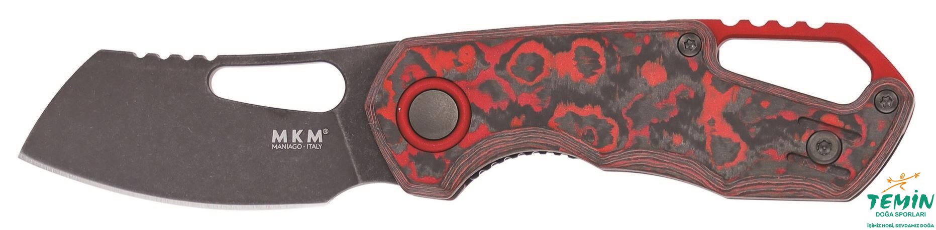Yandan kilitli (linerlock) çakının sap kanatları, özel bir karbon fiberden (‘‘Fat Carbon Materials’’ tarafından imal edilen ‘‘Lava Flow’’ yani ‘‘Lav Akıntısı’’ ismindeki hafif, dayanıklı ve şık kompozit malzeme; ilhamını, milyarlarca yıl önce gezegenimizi oluşturan kabuktan ve üzerindeki lav nehirlerinden almıştır. Bugün mavi ve yeşil olan dünyamızın kökeninde buna benzer bir görünüm bulunmaktaydı.) imal edilmiştir. Sap malzemesi içine gömülü çelik astarlar, sağlamlığı pekiştirmektedir. Sapın yerine takılmasında yine taşlanıp karartılan paslanmaz çelik bağlantı elemanlarının [Cıvataları söküp takabileceğiniz tork anahtarı (6/8) da pakete dâhildir.] kullanıldığı bu versiyonda, anodize edilerek kırmızı renk alan alüminyum ara parça sayesinde, geniş bir kordon deliği (lanyard hole) elde edilmiştir. İçinden kapaklı çengel (çengel karabina da denmektedir) geçebilecek genişlikte olmasıyla pratiklik (Dağcılıkta, rafting sırasında ve hatta doğa yürüyüşlerinde bu tür taşıma tercih edilebilmektedir.) sağlayan bu kordon deliği, namludaki başparmak deliği ile uyum taşımaktadır. Kordon deliğinin arkasında da kavramaya yardımcı çentiklere yer verilerek çakının daha iyi kavranması sağlanmıştır. MKM’nin alametifarikası sayılan pivot bağlantı elemanı pulu, yine kırmızı renk alacak biçimde anodize edilerek, ara parçayla uyumlu kılınan alüminyumdur.