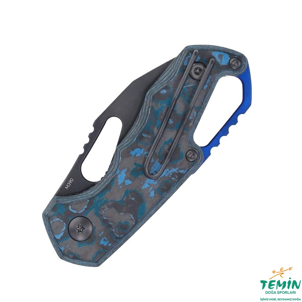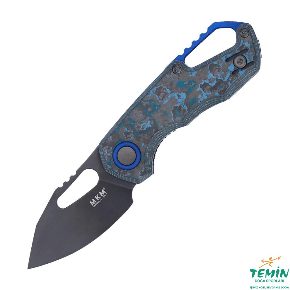 Yandan kilitli (linerlock) çakının sap kanatları, özel bir karbon fiberden (‘‘Fat Carbon Materials’’ tarafından imal edilen ‘‘Arctic Storm’’ yani ‘‘Kutup Fırtınası’’ ismindeki hafif, dayanıklı ve şık kompozit malzemeye, adı üzerinde, kutup siklonları ilham vermiştir. Buz dağlarını parçalayıp dalgaları metrelerce yükselten bu güçlü doğa olayına uzaydan bakıldığında ise, dingin ve yatıştırıcı bir mozaik izlenmektedir. Mavi ve grinin tonlarını taşıyan malzemede, elle yerleştirilen karbon fiber katmanların epoksi ile birleştirilmesiyle, hayranlık uyandıran bir görünüm elde edilmiştir.) imal edilmiştir. Sap malzemesi içine gömülü çelik astarlar, sağlamlığı pekiştirmektedir. Sapın yerine takılmasında yine paslanmaz taşlanıp karatılan çelik bağlantı elemanlarının [Cıvataları söküp takabileceğiniz tork anahtarı (6/8) da pakete dâhildir.] kullanıldığı bu versiyonda, anodize edilerek mavi renk alan alüminyum ara parça sayesinde, geniş bir kordon deliği (lanyard hole) elde edilmiştir. İçinden kapaklı çengel (çengel karabina da denmektedir) geçebilecek genişlikte olmasıyla pratiklik (Dağcılıkta, rafting sırasında ve hatta doğa yürüyüşlerinde bu tür taşıma tercih edilebilmektedir.) sağlayan bu kordon deliği, namludaki başparmak deliği ile uyum taşımaktadır. Kordon deliğinin arkasında da kavramaya yardımcı çentiklere yer verilerek çakının daha iyi kavranması sağlanmıştır. MKM’nin alametifarikası sayılan pivot bağlantı elemanı pulu, yine mavi renk alacak biçimde anodize edilerek, ara parçayla uyumlu kılınan alüminyumdur. MKM’nin kullanmayı sevdiği mavi rengin kökeninde ise, Maniago bıçak üretiminin ilk itiş gücünü sağlayan nehirler bulunmaktadır.
