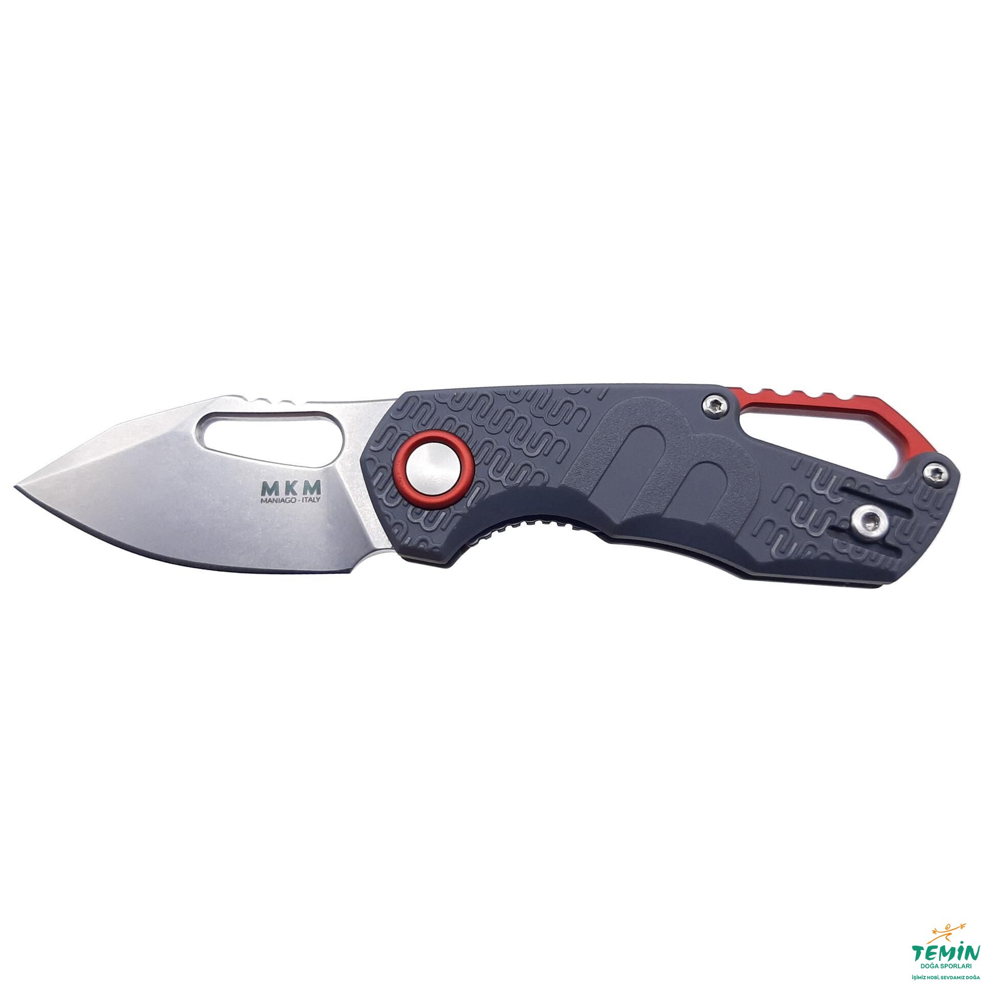 Anodize edilerek kırmızı rengi alan alüminyum ara parça sayesinde geniş bir kordon deliği (lanyard hole) elde edilmiştir. İçinden kapaklı çengel (çengel karabina da denmektedir) geçebilecek genişlikte olmasıyla pratiklik (Dağcılıkta, rafting sırasında ve hatta doğa yürüyüşlerinde bu tür taşıma tercih edilebilmektedir.) sağlayan bu kordon deliği, namludaki başparmak deliği ile de uyum taşımaktadır. Her iki deliğin arkasında da kavramaya yardımcı çentiklere yer verilerek çakıya hâkimiyet artırılmıştır. MKM’nin alametifarikası sayılan mavi renkte anodize edilen pivot bağlantı elemanı pulunun yerini kırmızı renkte anodize edilen alüminyum pul almıştır.