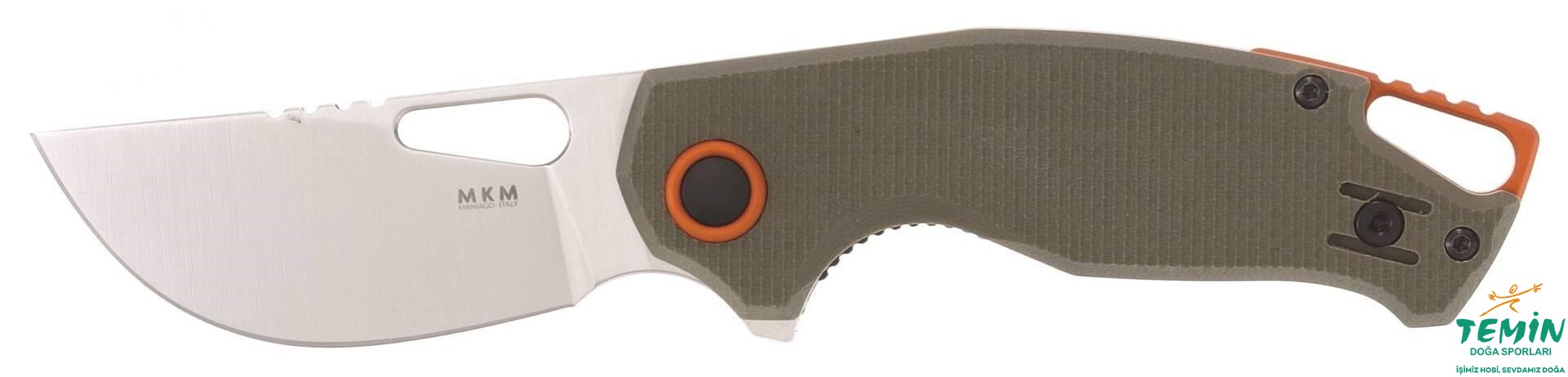 Yandan kilitli (linerlock) çakının sap kanatları, kamuflaj sağlayan hâki renkte (OD Green) G10’dan imal edilmiştir. Sağlamlığı ve kaydırmaz yapısıyla tanınan G10, kaba dokulu yüzeyiyle de iyi kavranmaktadır. Sap malzemesi içine gömülü çelik astarlar, sağlamlığı pekiştirmektedir. Çakı parçalarının bir araya getirilmesinde karartılmış paslanmaz çelik cıvatalar kullanılmıştır. MKM’nin alametifarikası sayılan pivot bağlantı elemanı pulu, anodize edilerek doğada kolay görünen turuncu renk kazandırılmış alüminyumdur. Aynı şekilde anodize edilerek turuncu renk verilen hafif ve dayanıklı alüminyum ara parça sayesinde, geniş bir kordon deliği (lanyard hole) elde edilmiştir. İçinden kapaklı çengel (çengel karabina da denmektedir) geçebilecek genişlikte olmasıyla pratiklik (Dağcılıkta, rafting sırasında ve hatta doğa yürüyüşlerinde bu tür taşıma tercih edilebilmektedir.) sağlayan bu kordon deliği, namludaki başparmak deliği ile de uyum taşımaktadır. Kordon deliğinin arkasında da kavramaya yardımcı çentiklere yer verilerek çakının daha iyi kavranması sağlanmıştır.