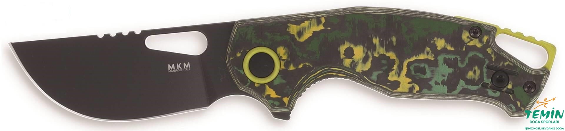 Yandan kilitli (linerlock) çakının sap kanatları, özel bir karbon fiberden (‘‘Fat Carbon Materials’’ tarafından imal edilen edilen “Toxic Storm” yani ‘‘Zehirli Fırtına’’ ismindeki hafif, dayanıklı ve şık kompozit malzeme; sarı, yeşil ve gri olmak üzere üç rengi bir araya getirmektedir. Bu niteliğiyle kamuflaj sağlamaya yönelik olarak da tercih edilebilmektedir.) imal edilmiştir. Sap malzemesi içine gömülü çelik astarlar, sağlamlığı pekiştirmektedir. Çakı parçalarının bir araya getirilmesinde karartılmış paslanmaz çelik cıvatalar kullanılmıştır. MKM’nin alametifarikası sayılan pivot bağlantı elemanı pulu, anodize edilerek siyah kılınmış alüminyumdur. Aynı şekilde anodize edilerek siyah kılınan hafif ve dayanıklı alüminyum ara parça sayesinde, geniş bir kordon deliği (lanyard hole) elde edilmiştir. İçinden kapaklı çengel (çengel karabina da denmektedir) geçebilecek genişlikte olmasıyla pratiklik (Dağcılıkta, rafting sırasında ve hatta doğa yürüyüşlerinde bu tür taşıma tercih edilebilmektedir.) sağlayan bu kordon deliği, namludaki başparmak deliği ile de uyum taşımaktadır. Kordon deliğinin arkasında da kavramaya yardımcı çentiklere yer verilerek çakının daha iyi kavranması sağlanmıştır.