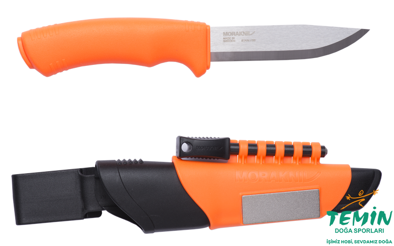Sırt kısım ateş başlatıcı kullanmaya uygun taşlanmış. Termoplastik kauçuk olan TPE sap oldukça ergonomik ve güvenli. Bushcraft meraklıları için donanımlı ve hazır olan Bushcraft Survival Orange, ateş başlatıcı çubuk ve elmas yüzeyli bileyici ile birlikte sunuluyor. Bıçağın sapının tamamı ve polimer kılıfının ateş başlatıcı ile elmas yüzeyli bileyicinin takılı olduğu kısmı, kolaylıkla fark edilmesini sağlayan turuncu renkte.