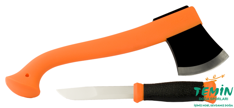 Ormana çıkış seti: turuncu saplı Outdoor Axe (deri kılıflı) + Mora 2000 (polimer kılıflı). Kaba işten ince işe uygun kombine ağız yapısıyla sahada pratik.