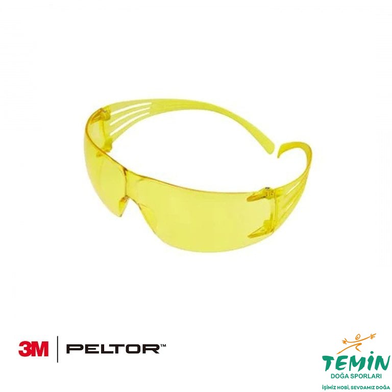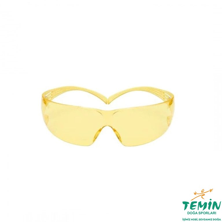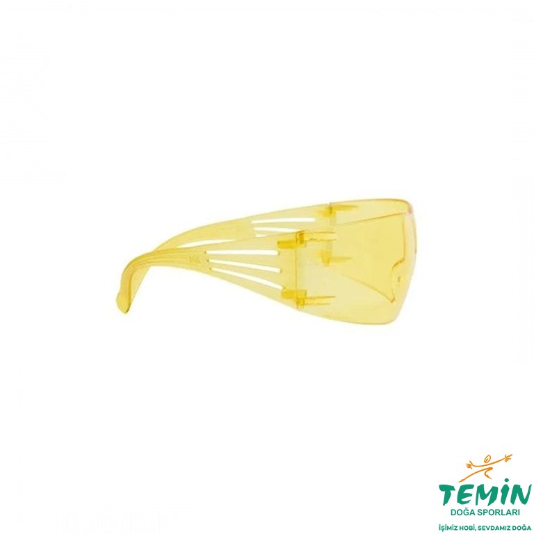 Sarı/amber lensli 3M SecureFit 203; başı saran tasarım ile geniş görüş ve kaymayı azaltmaya yardımcı olur. 18 g hafiflik, buğu önleyici–çizilmeye dayanıklı kaplama ve kulaklıkla uyumlu düz/esnek saplar.