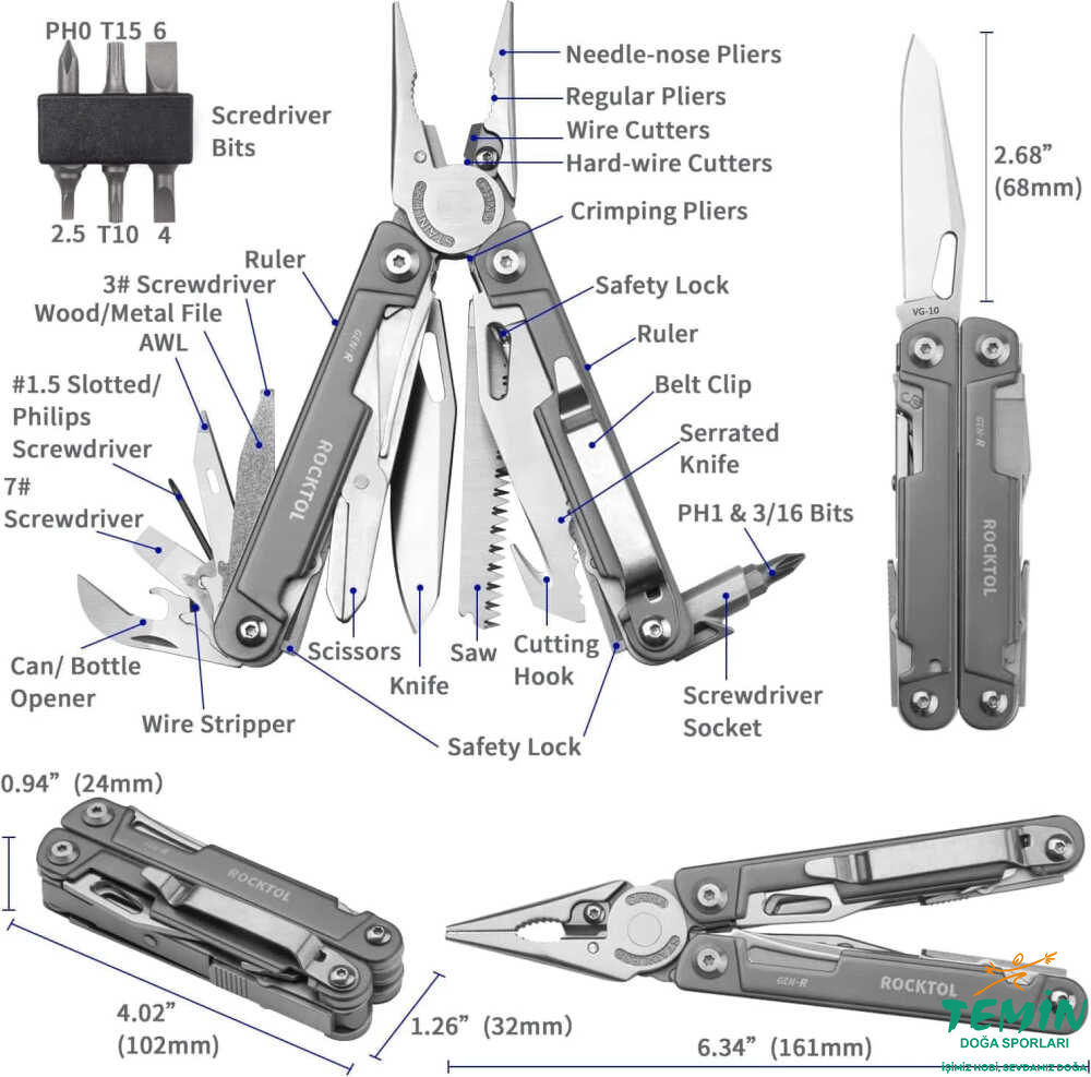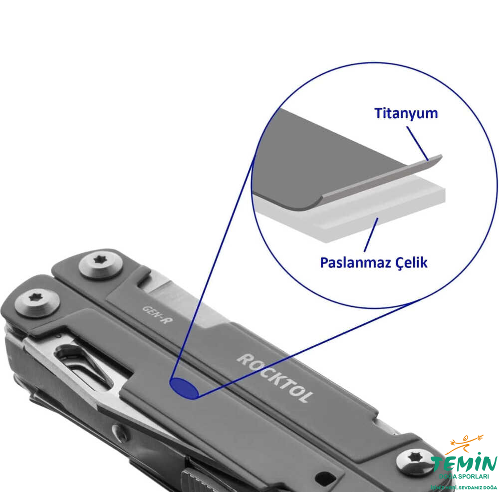 VG10 Çelik Bıçak : ROCKTOL Gen-R multitool, HRC60 sertliğe kadar ulaşabilen VG-10 paslanmaz çelikten yapılmış bir cep bıçağı bıçağına sahiptir. Bu sayede üstün keskinlik ve uzun süreli kesme performansı sunar.