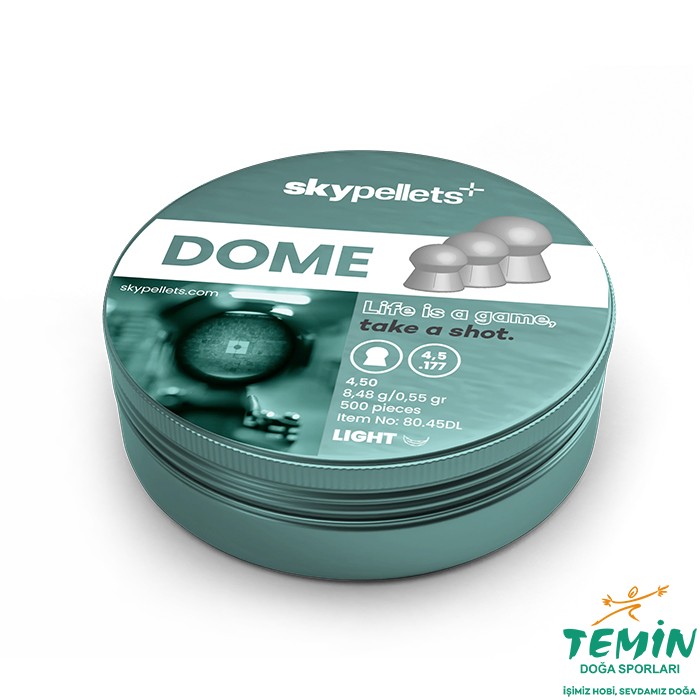 Skypellets Dome Light 4,5 mm kubbe uç saçma; 500 adet metal kutuda, 8,48 grain (0,55 g) ağırlıkla dengeli ve isabet odaklı atışlar için ideal.
