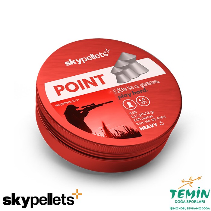 Sivri uçlu (point) Skypellets Point Heavy havalı saçma; taşıma deformasyonlarına karşı metal kutu ile sunulur. 4,50 mm, 500 pelet, 0,53 g / 8,17 grain teknik değeriyle.