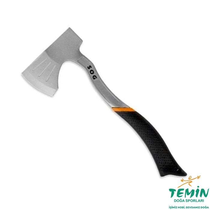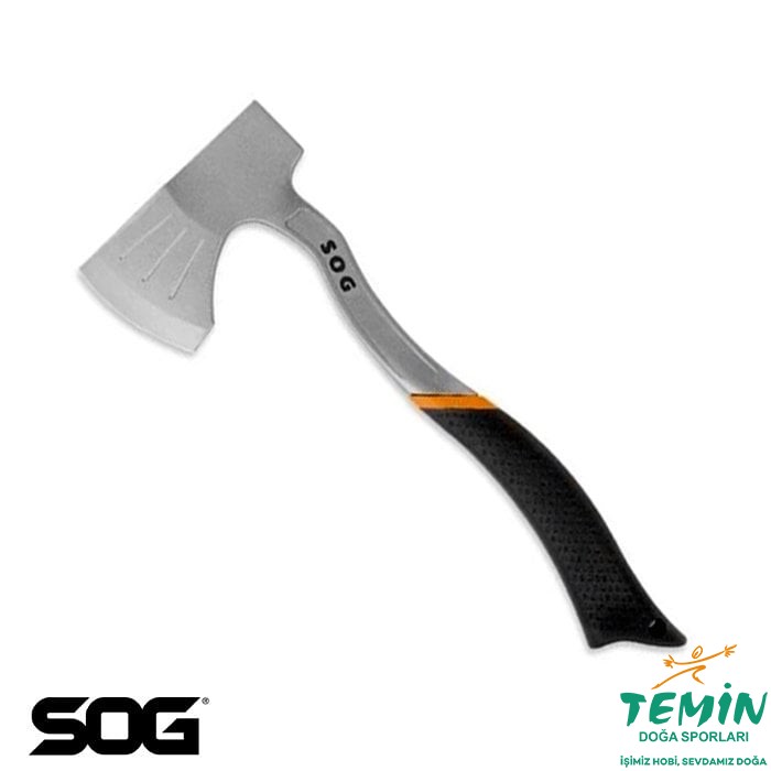 Çekiç arkalı SOG F16N kamp baltası; termal kalıplı kauçuk sap, kemer klipsi ve sert naylon kılıfıyla sahada pratik taşıma sunar (935 g, 35,7 cm sap).