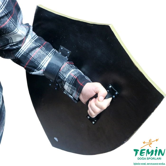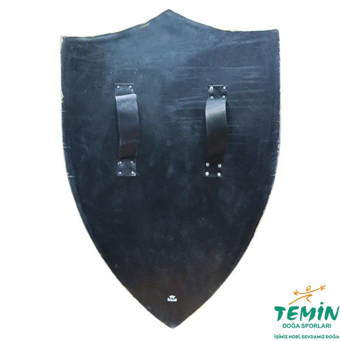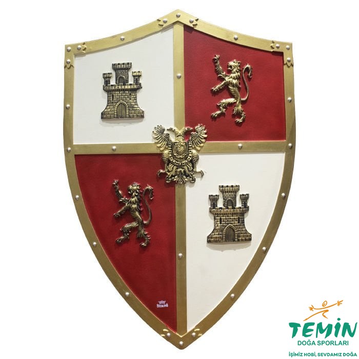 Ön kısmı 4 bölmeye ayrılmış, her bölmesinde altın rengi (aslan ve kale) işlemelerine sahip, bu bölümlerin birleştiği orta kısmında ise yine altın rengi işleme ile yapılmış çift başlı kartal bulunan, 47x63,5 cm boyutlarında köpük kalkan.