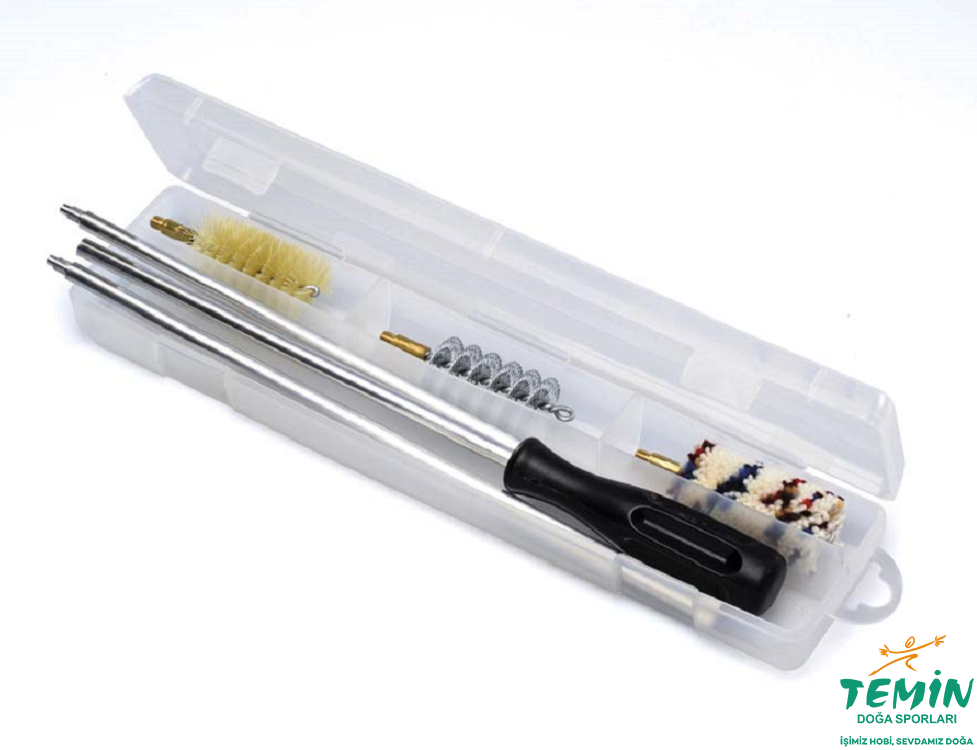 Alüminyum Harbi Temizleme Kiti, av tüfeği namlu bakımında temel ihtiyaçları karşılayan pratik bir settir: 3 parça alüminyum harbi ve 3 farklı temizlik ucu (spiral çelik, yün, naylon) ile gelir.