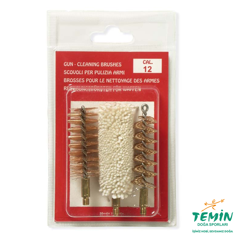 12 kalibre harbi çubuğunun zamanla yıpranan uçlarını yenilemek için hazırlanmış yedek settir: yün mop, bronz fırça ve spiral bronz fırça bir aradadır.