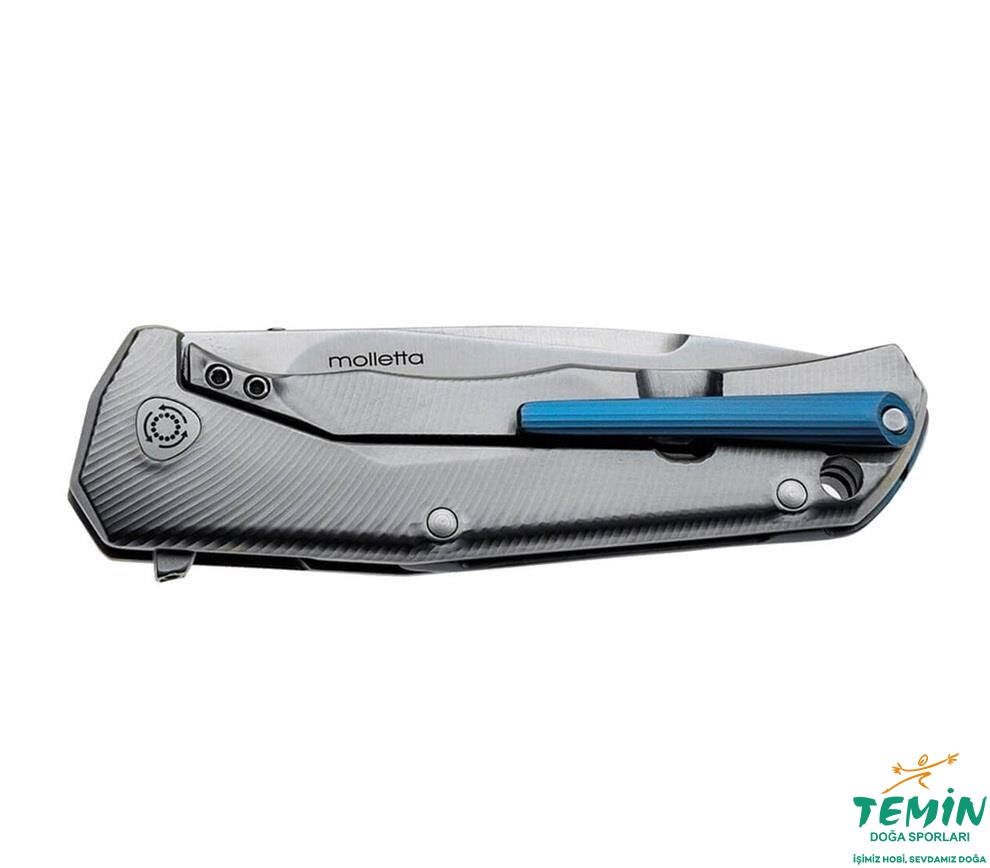 İzlediğiniz TRE BL versiyonunun sap kanatları, pürüzlü dokuya sahip bir desen kazandırılmış, bronz renkte titanyumdur. Böylelikle hafif, sağlam ve iyi kavranabilen şık bir yapı elde edilmiştir. Kullanılan rulman sayesinde (IKBS) namlu, hızlı ve rahat bir açıma kavuşmuştur. Çakı, gövdesi ile aynı özellikteki (6Al4V) ve mavi renkteki titanyum cep klipsi sayesinde kolaylıkla taşınabilmektedir.