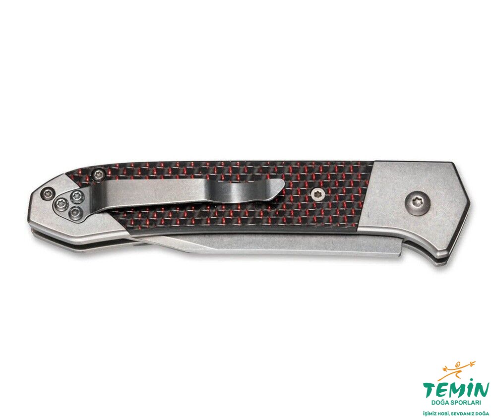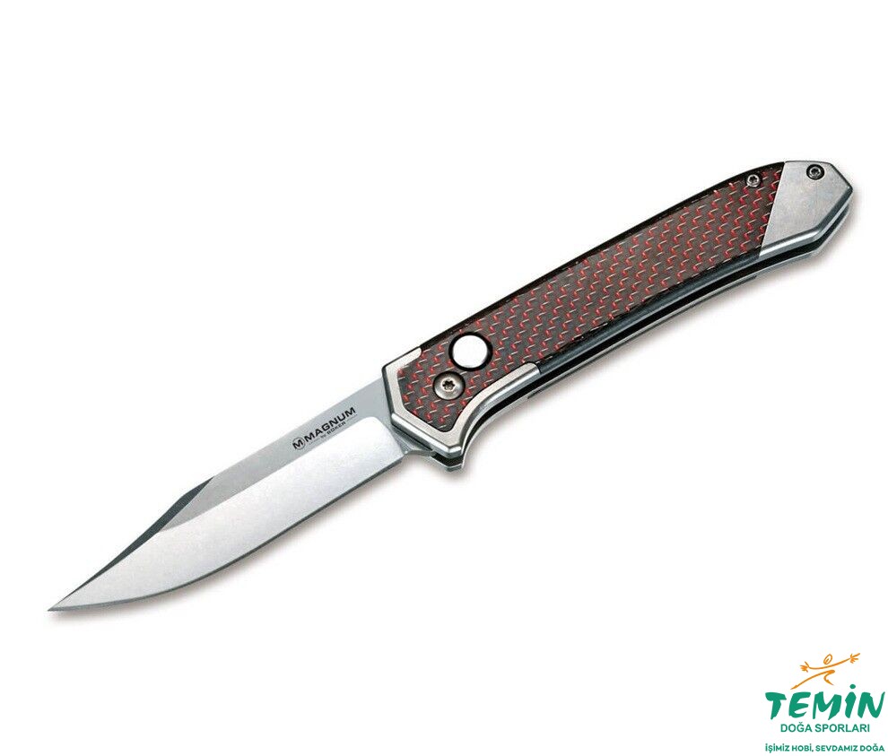 Modern Magnum Rubico Auto, yenilikçi malzemeler ve güçlü bir yay mekanizmasına sahiptir. 440A bıçak hafif taş yıkama kaplamaya sahiptir ve bir düğme ile otomatik olarak açılır. Çakıyı kapatmak için düğmeye tekrar basın. Sap malzemesi, çakıya çok özel bir görünüm veren kırmızı ışıltılı karbon fiberdir. Bir klips ile (uç yukarı).
