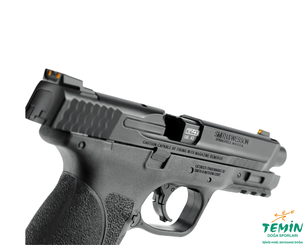 M & P9 M2.0 T4E .43 kalibrelik paintball, kauçuk veya biber cephanesi ateşler.