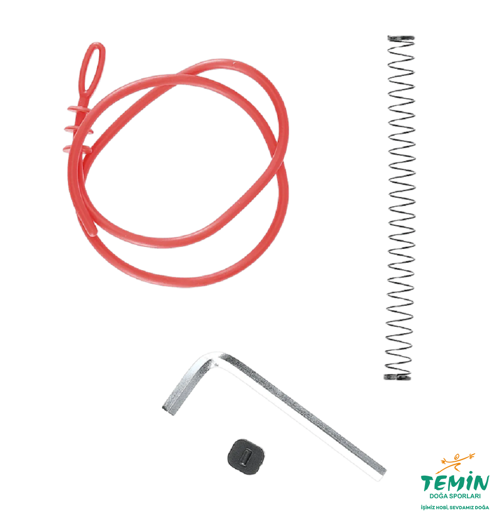 Kauçuk mermileri atmak için yedek bir şarjör yayı, bir temizleme sileceği ve büyük bir arka kayış dahildir.