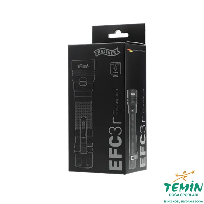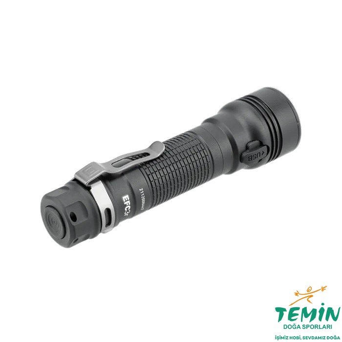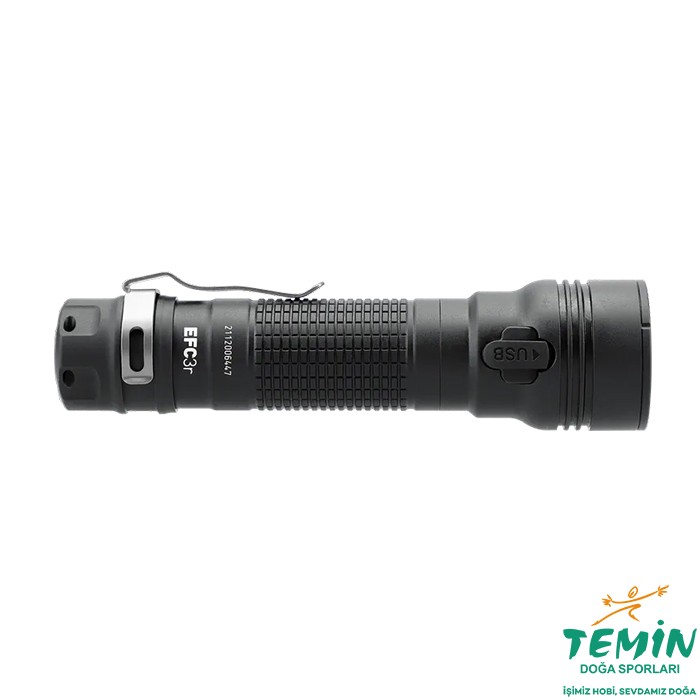 Açık hava/avlanma, eğlence ve polis kullanımı gibi parlak ışık gerektiren zorlu durumlar için önerilir. Kafadaki dört LED sabit bir lens sistemindedir ve hem aralık hem de genişlikte optimum aydınlatma için 3000 lümene kadar ışık sağlar. 21700 şarj edilebilir pil ve şarj soketi (USB-C) ile beş parlaklık seviyesi (10/50/200/1000/3000 lümen) sunar. Parlaklık seviyeleri ve özel modlar (flaş ve işaret) yan taraftaki anahtarla etkinleştirilir. Bellek ünitesi, EFC3r'nin her zaman en son kullandığınız düzeyde açılmasını sağlar. Kullanılabilir pil kapasitesi %25'in altına düştüğünde bir sinyal verilir. Kolaylık sağlamak için çıkarılabilir bir paslanmaz çelik klipse sahiptir. Sağlam alüminyum muhafaza sert anodize edilmiştir ve IPX8'e göre su geçirmezdir. Naylon kılıf, kordon, 21700 şarj edilebilir Li-ion pil, şarj kablosu ve yedek conta ile birlikte gelir.
