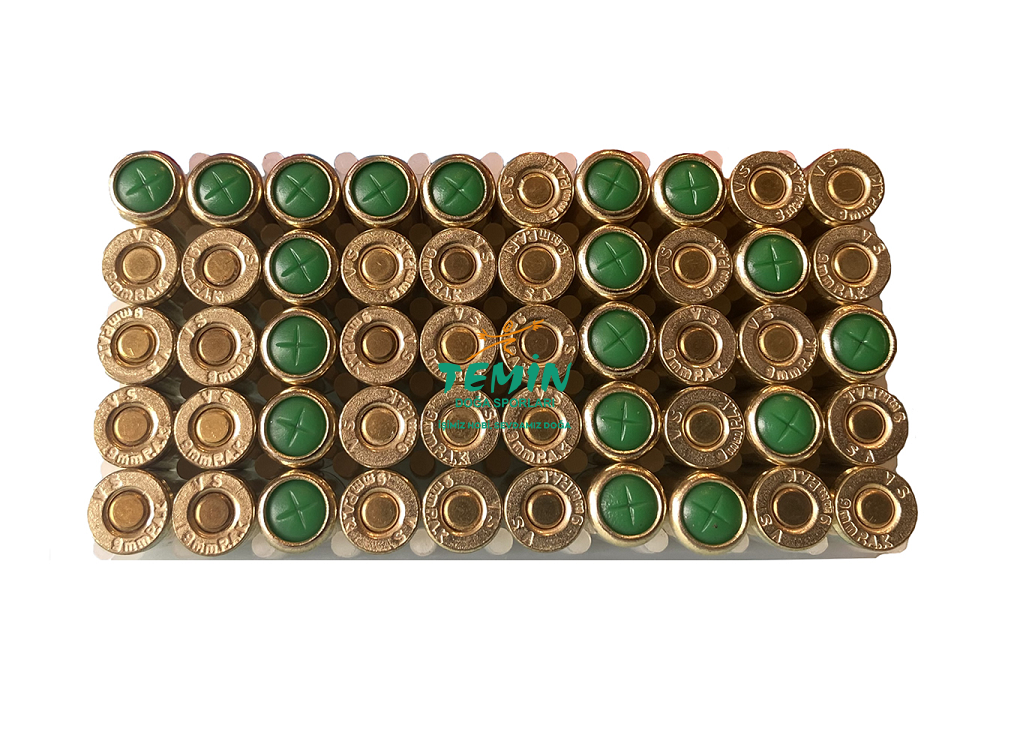400 ile 425 Bar arası, yüksek derecede basınca sahip, 50 adet 9 mm kurusıkı tabanca mermisi