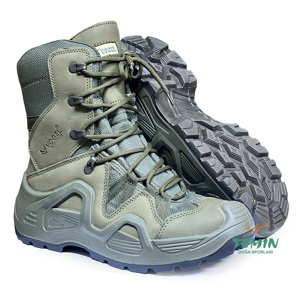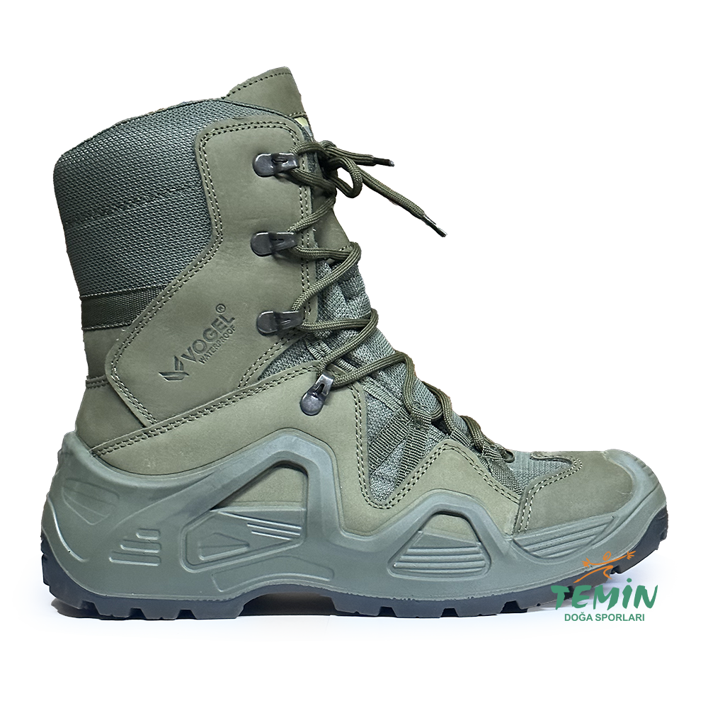 Vogel Canyon 1490 fermuarsız waterproof haki askeri bot nubuk deri yüzeyi ve haki rengi ile askeri kullanım amacının yanında günlük kullanım için tarz bir görünüm sunuyor.
