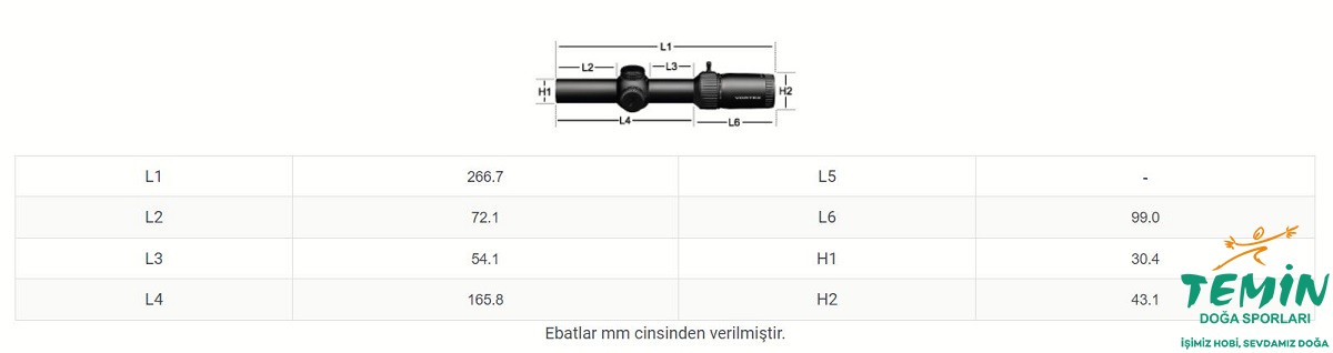 Retikül ölçeği tüm büyütme aralıklarında ebadını korur. Menzil, tutma ve rüzgar sapması düzeltmesini tahmin etmek için kullanılan listelenmiş retikül ölçümleri en yüksek büyütme oranına göre hesaplanmıştır.
