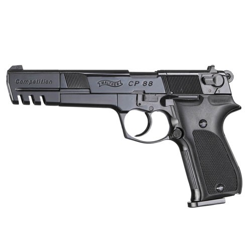 Walther CP88 Competition Black; 12g CO2 ile 4,5 mm pellet atış yapar. Blowbacksiz yapısı, full metal gövdesi, 8’li kapasitesi ve ayarlanabilir geziyle hedef atışı/eğitim için güçlü bir klasik.