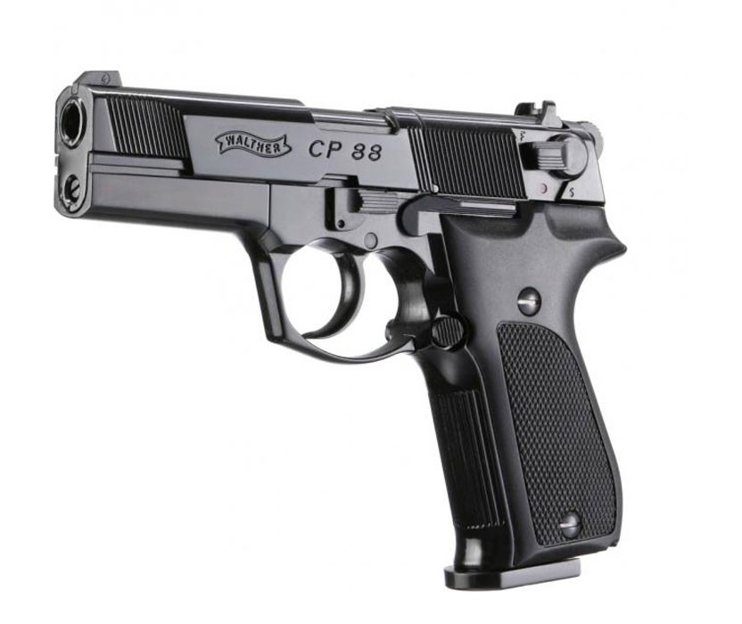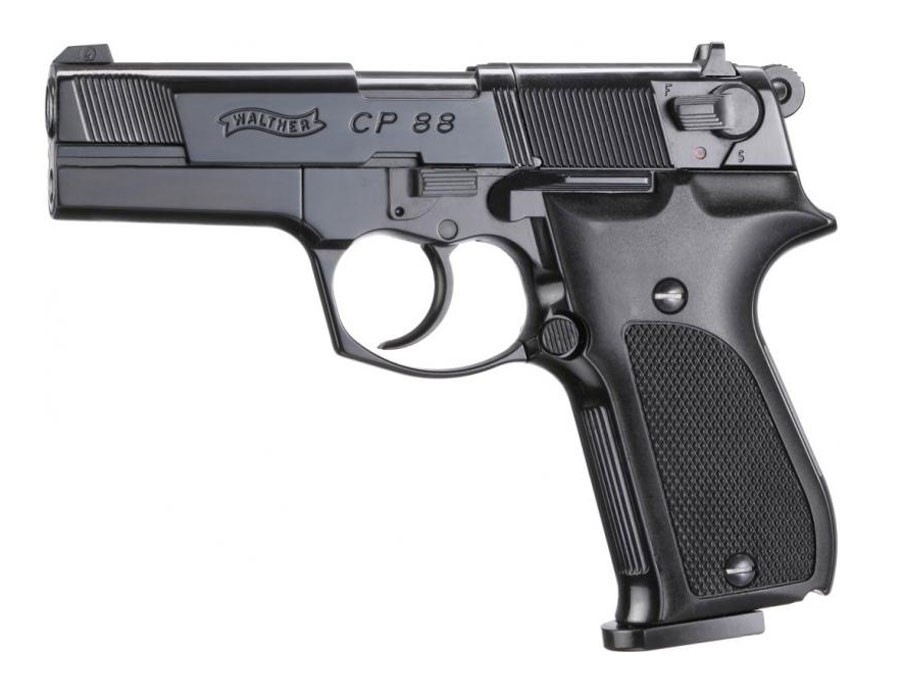 Walther CP88 Siyah; 12g CO2 ile 4,5 mm pellet atar. Full metal gövde, 8’li döner şarjör ve SA/DA tetikle hedef atışlarında dengeli, klasik bir tabancadır.