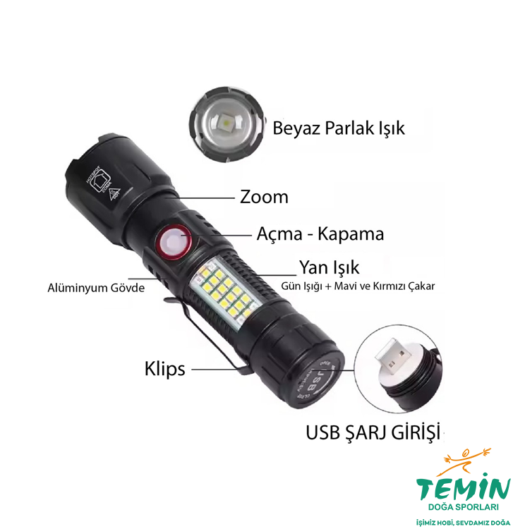 Ultra güçlü USB şarjlı polis el feneri, 1000 lümen ışık, ZOOM yakınlaştırma, kırmızı ve mavi çakar fonksiyonu olan kaliteli bir el feneridir.